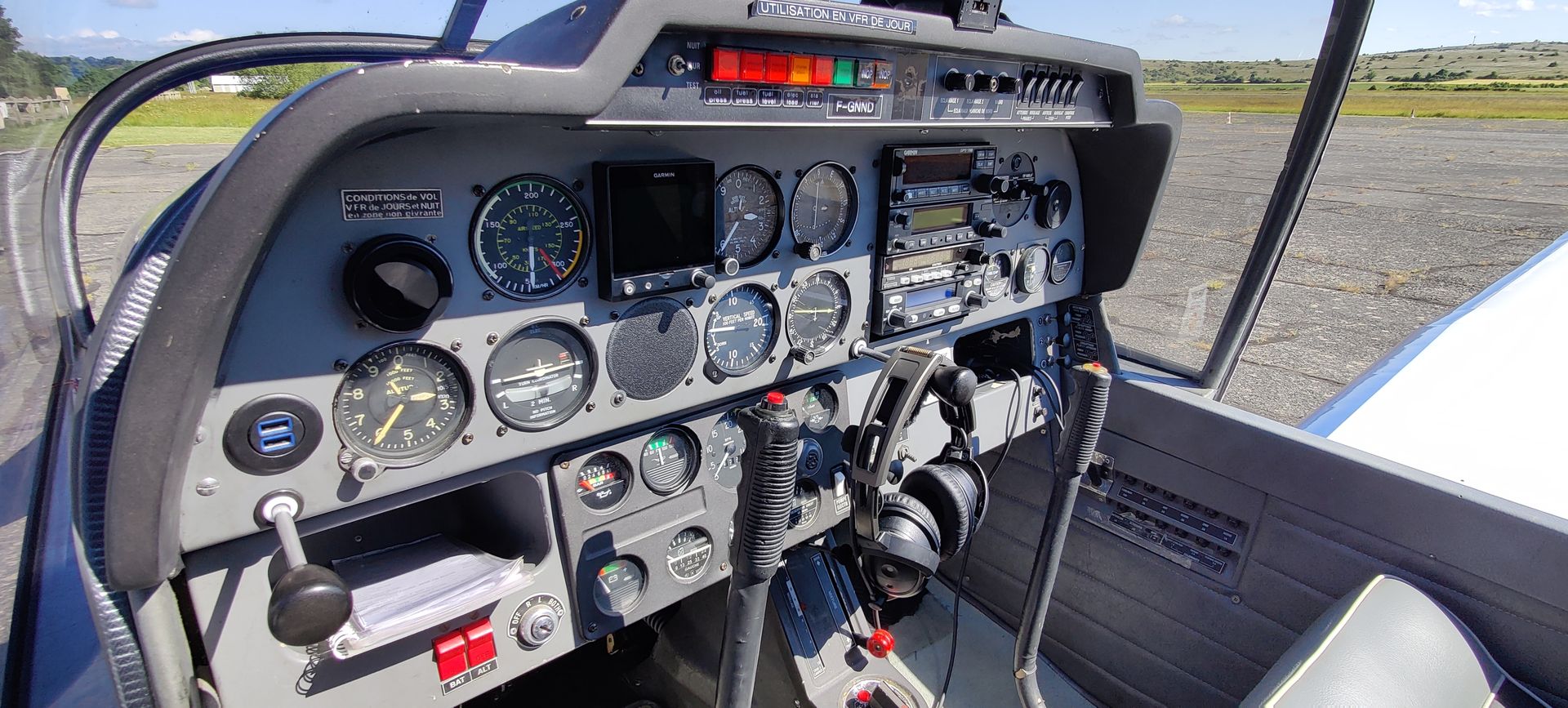 Juste après le décollage, Michel me demande de monter à 4 000 pieds et de prendre un cap au 241, en direction de Saint Affrique-Belmont. Heureusement, notre Robin est équipé d'un Garmin G5 moderne, qui nous sert d'horizon artificiel, et sur lequel est notamment affiché le cap de manière très lisible. Ainsi, il est relativement facile de suivre un cap au degré près, avec beaucoup plus de précision que notre compas magnétique. Malgré tout, pour un pilote en herbe comme moi, tenir un cap avec précision monopolise déjà la majorité de mon attention. Tracté par nos 160 chevaux galopants sous le capot, nous voilà déjà à 4 000 pieds, et évidemment, je m'en aperçois un peu tard, trop concentré sur mon cap.